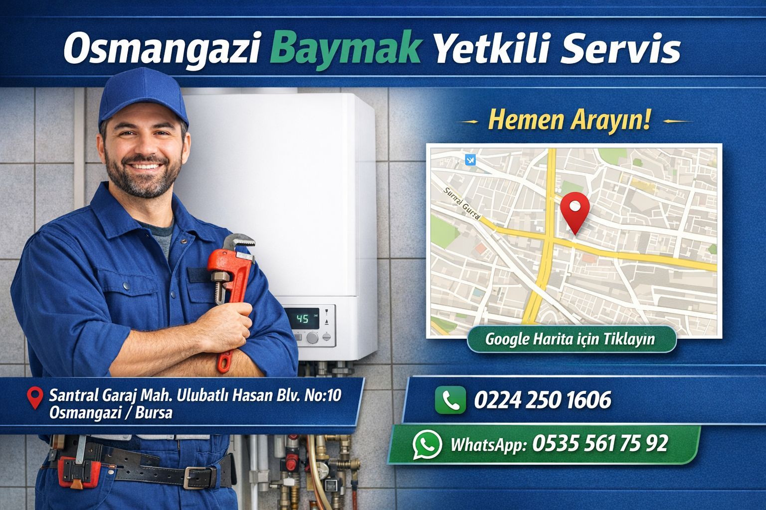 Kombinizle ilgili her türlü ihtiyaçta, tek bir telefonla bölgenizdeki en uzman ekibe ulaşmanın rahatlığını yaşayın. Osmangazi Baymak servisi arayışınızda, yerel tecrübemiz ve orijinal parça desteğimizle her zaman yanınızdayız. Kurumsal hizmet yapımız ile mahalle sıcaklığındaki yaklaşımımızı birleştirerek, sizlere en iyi deneyimi yaşatmayı hedefliyoruz. Bakım, onarım veya montaj fark etmeksizin tüm taleplerinizde en yakın çözüm ortağınız olmaya devam ediyoruz. Güvenli, hızlı ve ekonomik bir hizmet için Osmangazi'deki uzmanlığımıza güvenin.